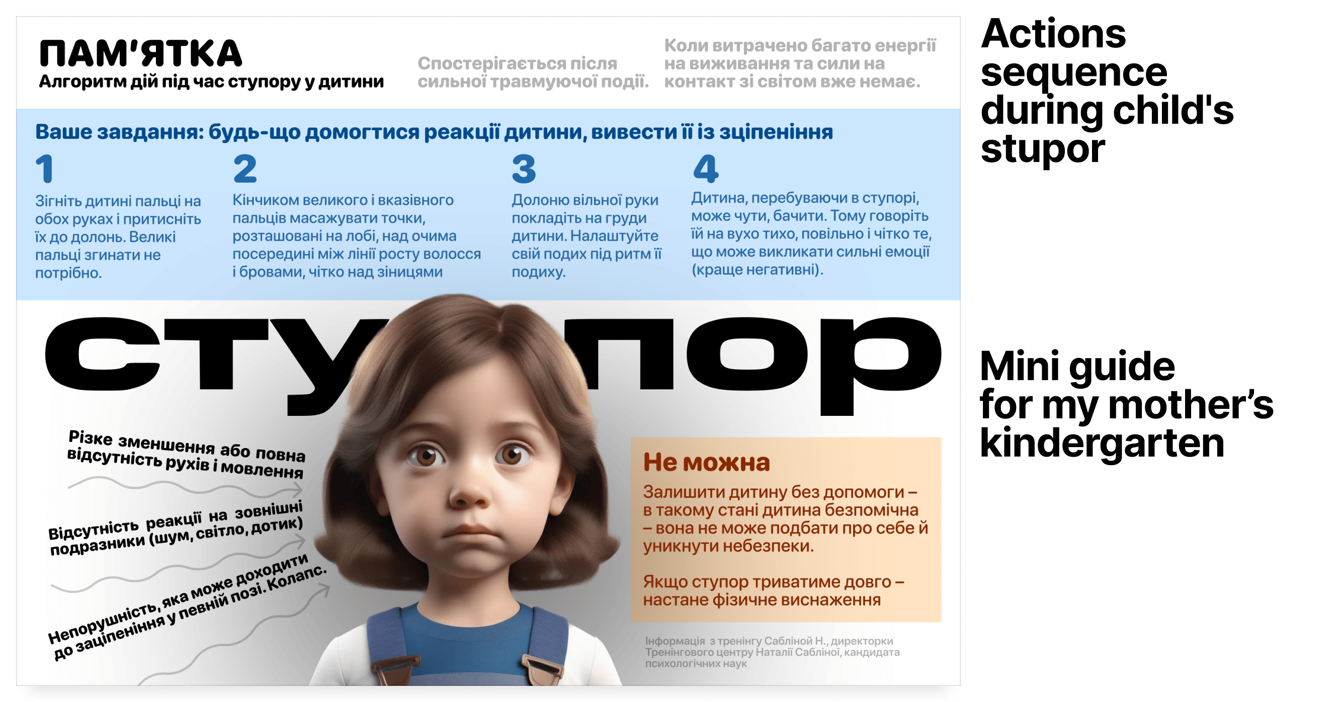 In October 2023, my mother asked me to make a mini guide, an A4 to be hanged on a wall, about the signs of stupor in a child and options for handling this state. My mother provided the text, and I finalized it in a couple of hours. It was a small job, but it turned out well for the time it took.